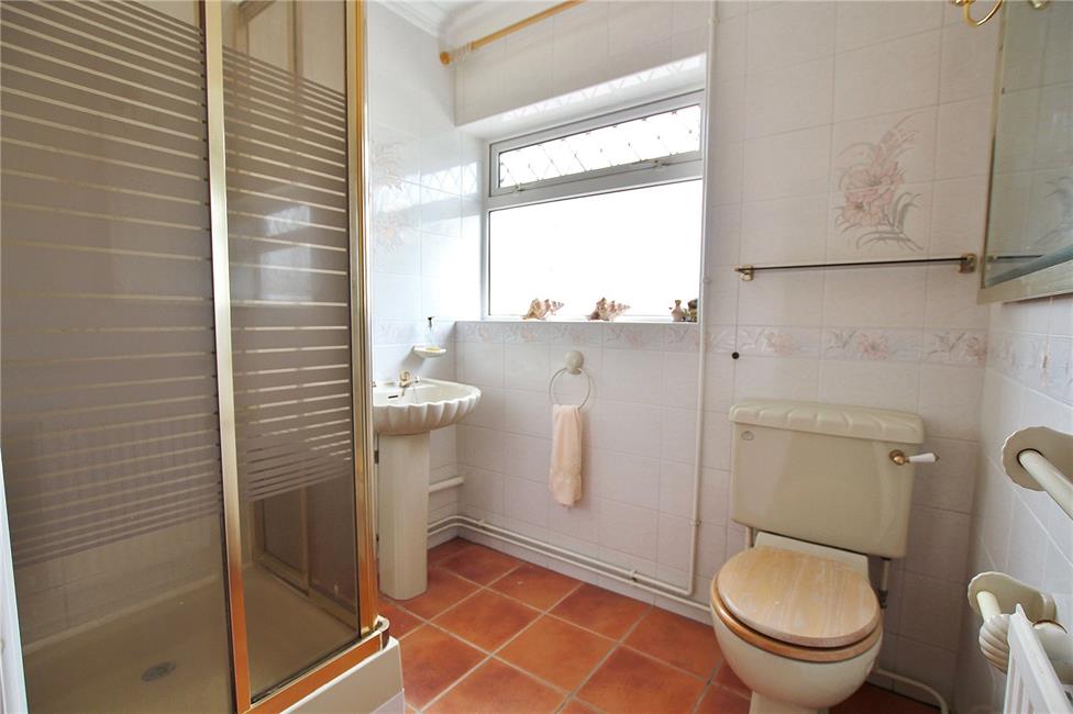 Opaque window to the side, shower cubicle with Mira thermostatic shower controls with comprehensive ceramic wall tiling, pedestal wash hand basin, close coupled WC, radiator, ceramic floor tiling, coved ceiling.