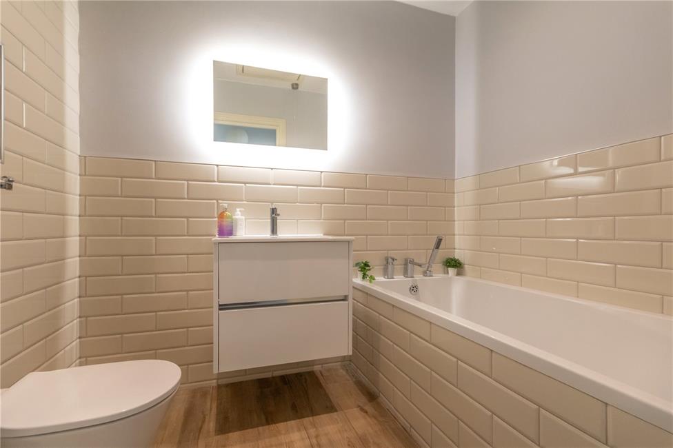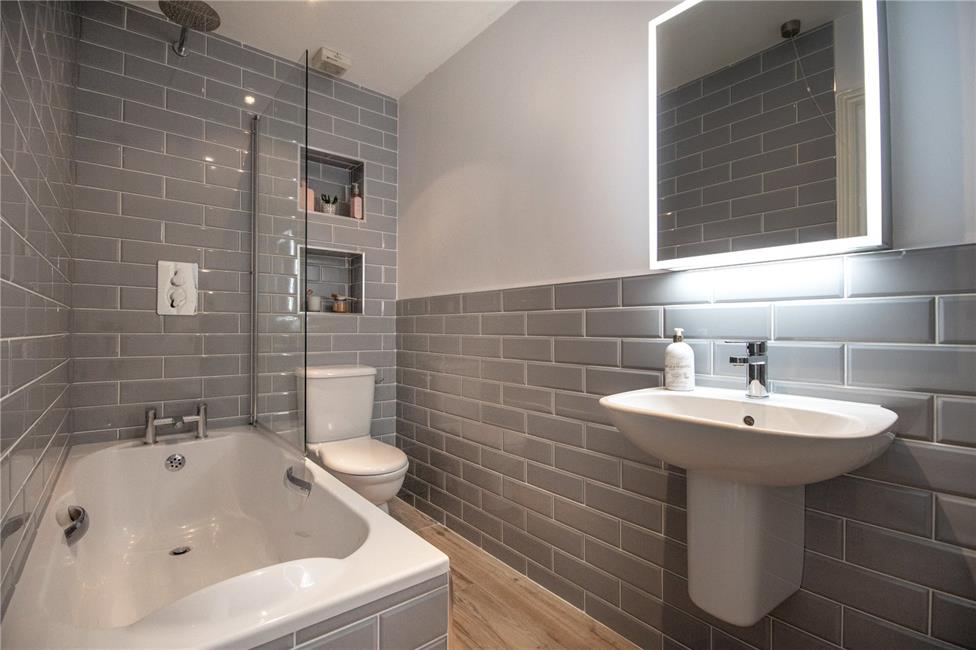 Suite comprising panelled bath and shower with Porcelanosa fittings, shaped porcelain wash hand basin with cupboards below, low level WC, ceramic wall tiling to wet areas, chrome heated towel rail. Access to loft.