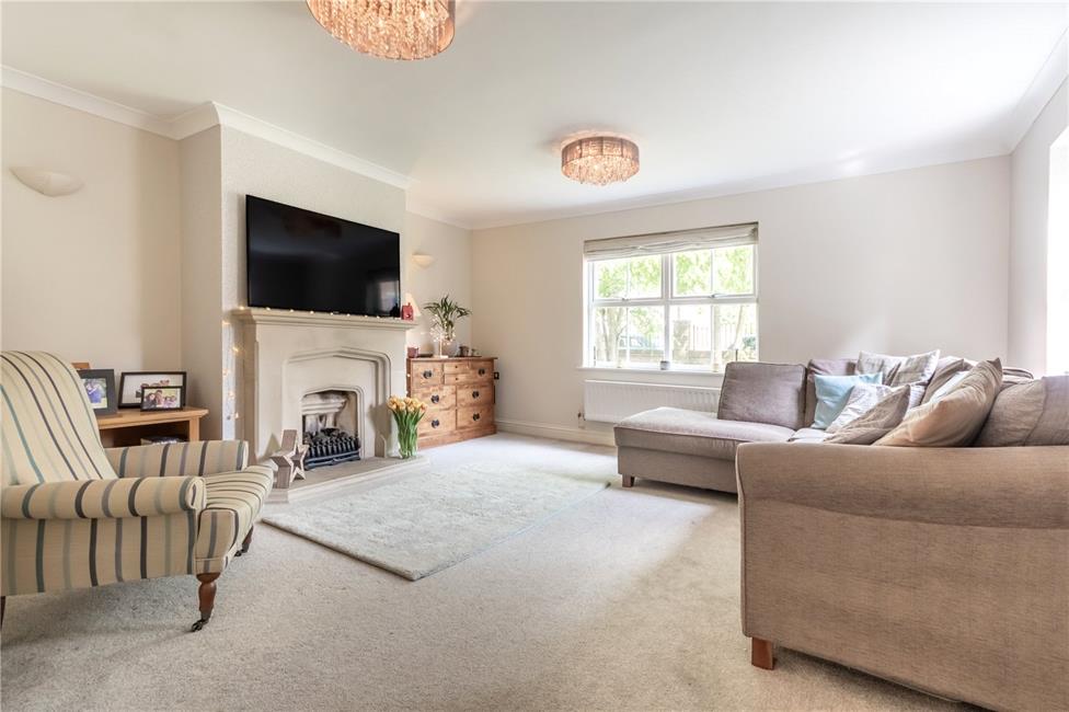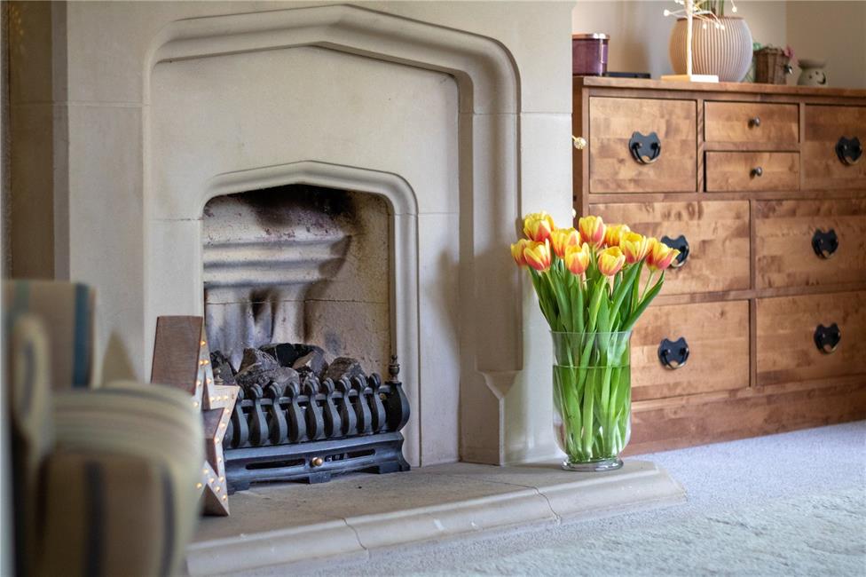 Overlooking the front garden and entrance approach, feature Minster Stone style fire surround with matching hearth and mantle, living flame coal effect gas fire, panelled radiator, twin doors returning to hall.