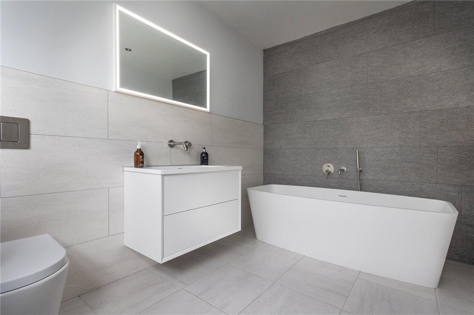 Stylish suite by Lusso comprising low level WC, wash hand basin with cabinet below, freestanding bath, Porcelanosa large feature wall tiling to wet areas, tiled flooring, heated towel rail.