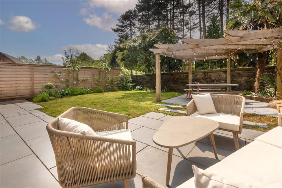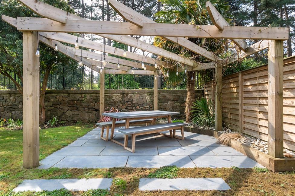 Wide stone patio area, full width of the property leading onto an attractive pergola relaxation area with shaped lawns, shrubs and plants and enjoying an open and south facing sunny aspect. Outside lighting. Outside water tap and electrical points. Gate to side leading to front.