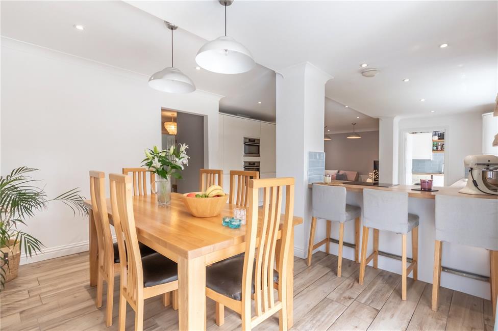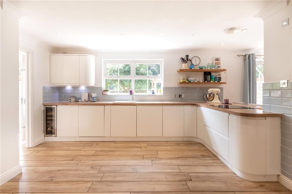 Well-appointed along three sides in high gloss fronts beneath hardwood worktop surfaces, inset one and a half bowl sink with mixer tap, ceramic wall tiling to worktop areas, feature peninsula breakfasting bar/island to dining area, inset four ring AEG induction hob, matching range of base and eye level wall cupboards with pelmets and boarders, concealed lighting, integrated wine cooler, integrated full height freezer with matching front, integrated fridge full height with matching front, integrated AEG oven, integrated AEG micromat-combi microwave, skirting board night lighting, integrated dish washer with matching front, pleasing aspect to rear garden, quality tiled flooring, family area zone ideal for young children, LED ceiling spotlighting, double panelled radiator.