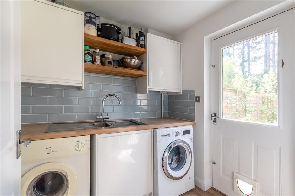 Inset one and a half bowl stainless steel sink with drainer and mixer tap, matching range of base and eye level wall cupboards with pelmets and boarders, plumbed for automatic washing machine, quality tiled flooring, concealed wall mounted Worchester gas central heating boiler, door leading to the rear garden.