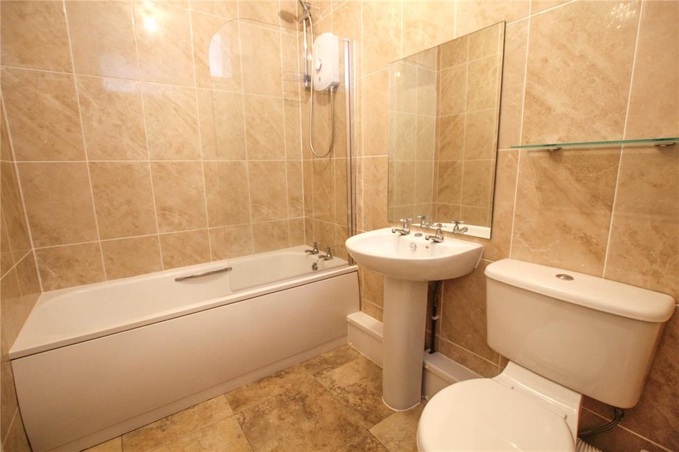 A modern white suite comprising of a twin grip steel panelled bath with Triton electric shower over and ceramic wall tiling to majority of the walls, pedestal wash hand basin with vanity mirror, close coupled push button WC, radiator, shaver point, ceramic floor tiling.