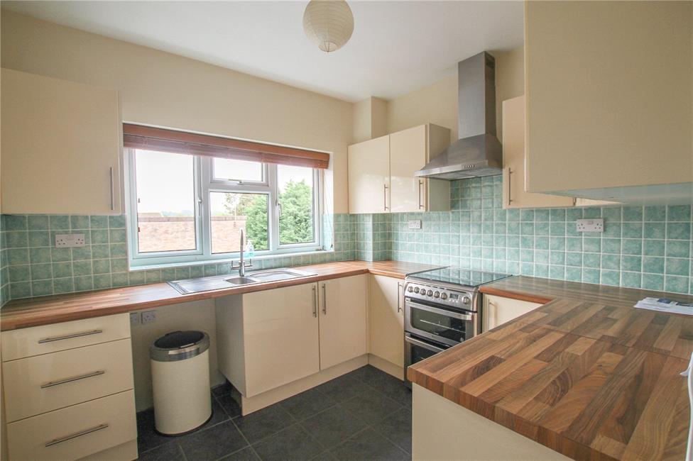 A modern gloss cream finish kitchen with stylish brushed chrome straight bar handles, appointed along three sides comprising of eye level units and base units with drawers and wood effect round nosed worktops over, ceramic wall tiling to work surface surrounds, slot for a cooker, plumbing and space for a dishwasher, slot for low level fridge, double radiator, ceramic floor tiling.
