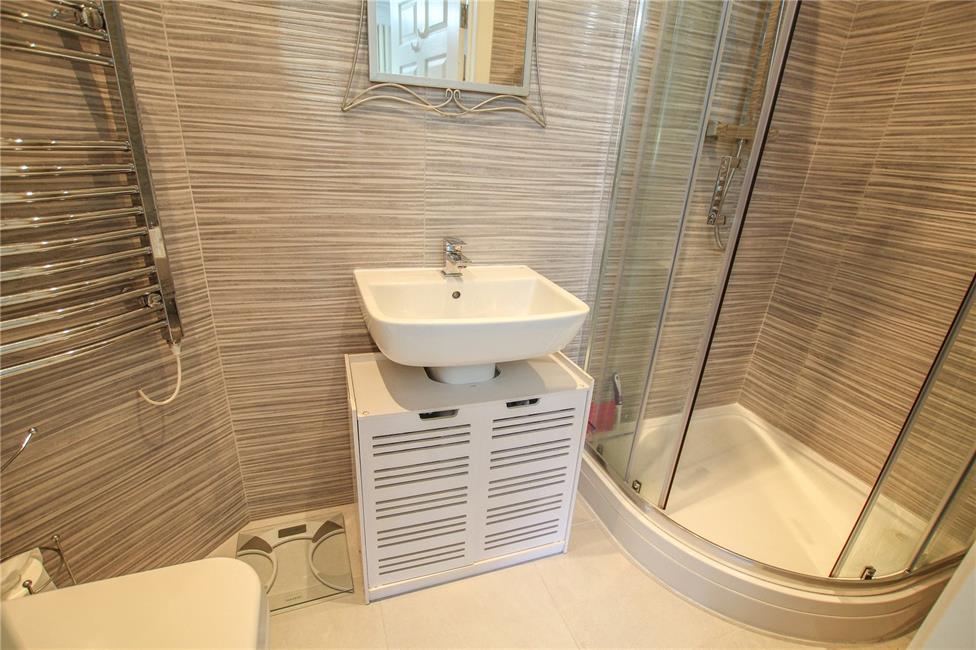 Stylish en suite comprising large corner shower with shower head and shower screen with doors, wash basin, low level WC, heated towel rail, ceramic wall tiling to wet areas, tiled flooring.