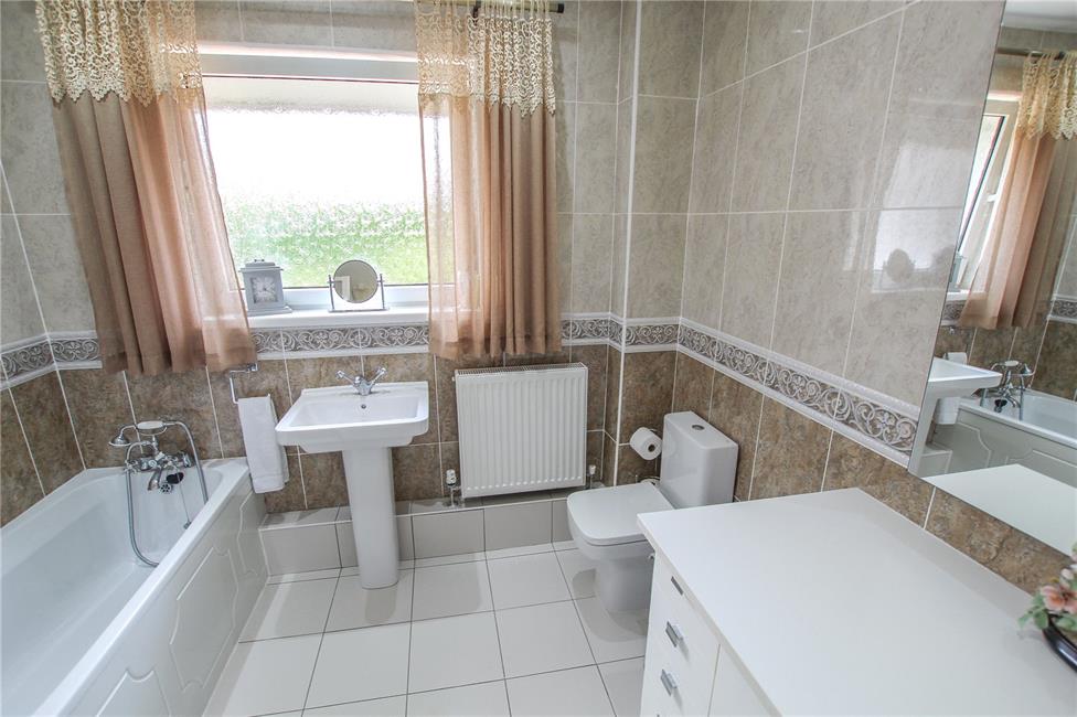 Spacious bathroom, modern white suite by Roca, comprising panelled bath, large shower, shower head and glazed shower screen panels, pedestal wash hand basin, low level WC, matching bespoke dressing table area with base cupboards and drawers, ceramic wall tiling with border tile, air extractor fan, ceiling spotlighting.
