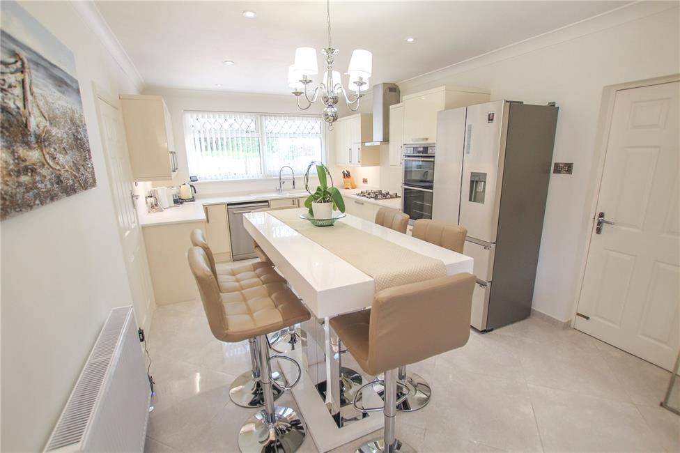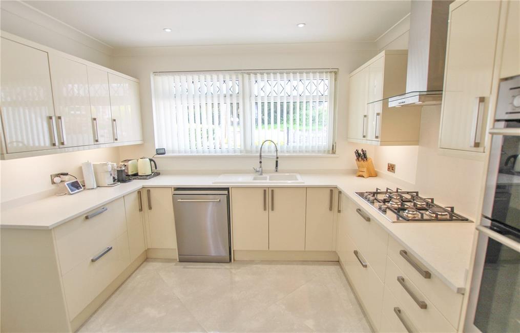 Appointed along two sides with lipped worktop surfaces, inset Franke stainless steel sink with drainer and mixer tap, wealth of base and eye level wall cupboards, tiled flooring, double glazed door to rear garden and connecting door to integral garage.