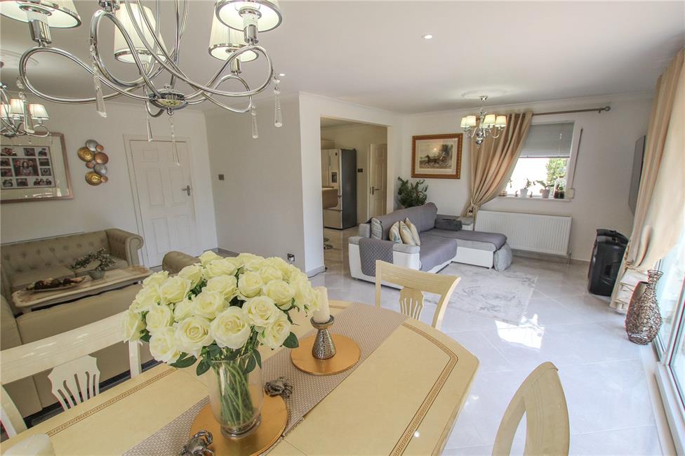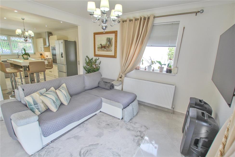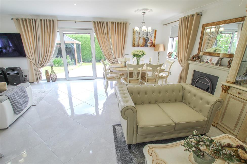 L-shaped, featuring delightful views to the rear garden and central double glazed sliding patio doors and matching floor to ceiling double glazed side screens, quality tiled flooring with matching tiled skirting boards, two radiators, additional windows to side, opening to kitchen/dining area.