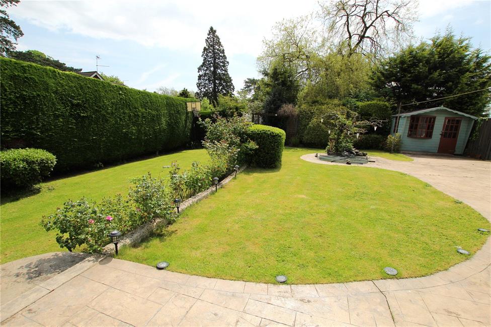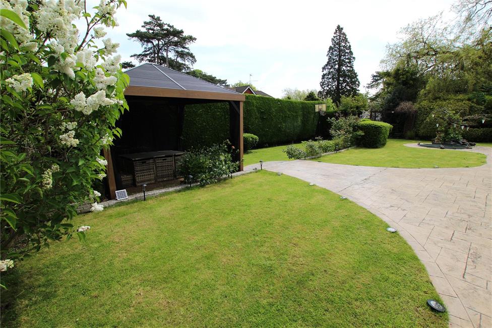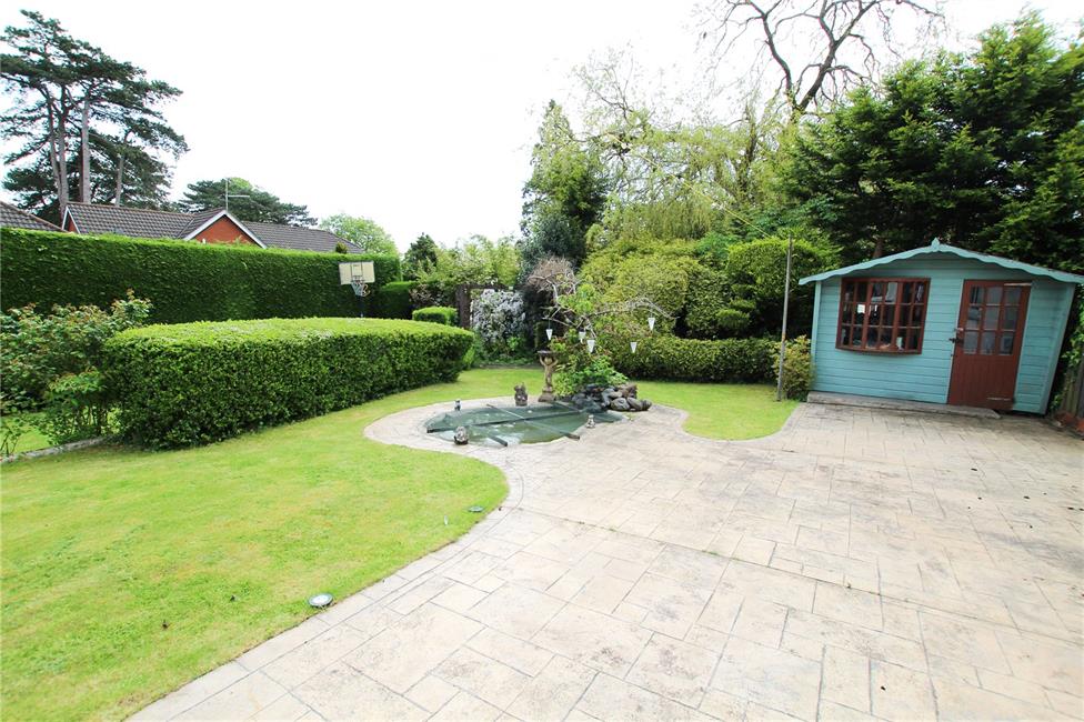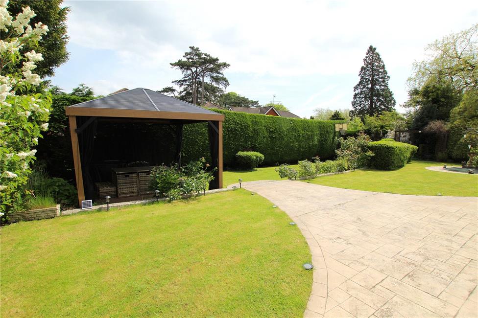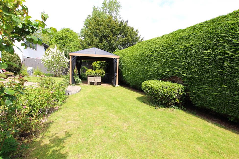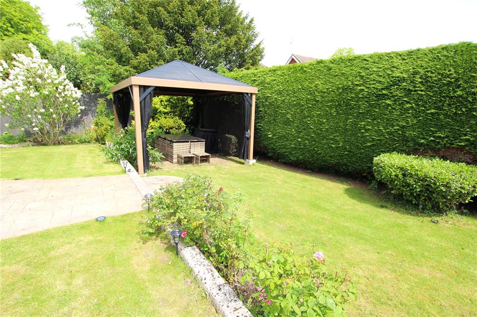 Beautifully presented and well maintained having shaped areas of lawn with wide wrap around patio areas ideal for sitting out and relaxation. Feature gazebo ideal for eating al fresco. Well stocked garden with a wealth of rose bushes, flowering plants, pergola and shaped hedges. Secret vegetable garden area at far end. Chalet summerhouse with fish pond focal point. Additional storage area to side.
