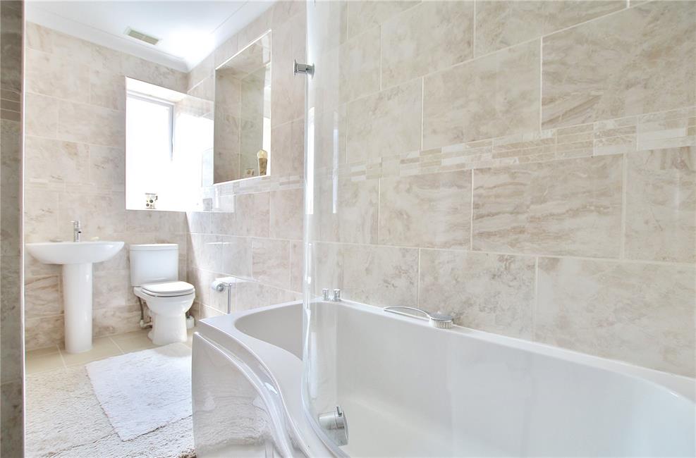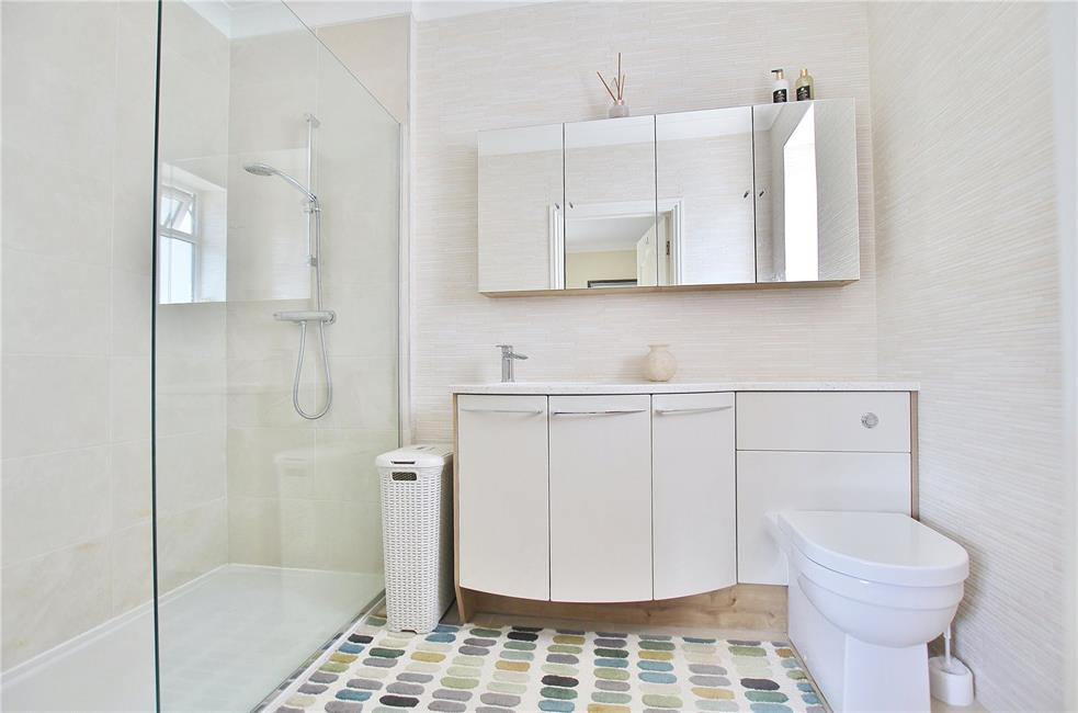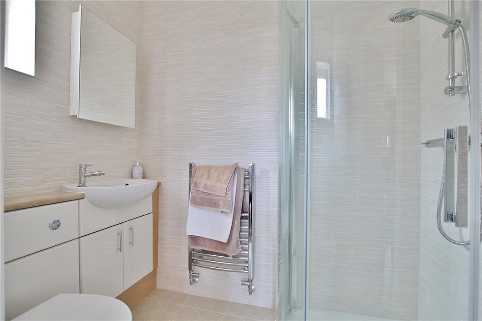 Comprising treble-width shower with glazed shower screen panel, stylish shaped wash basin with display surface and cabinets below, low level WC, attractive ceramic wall tiling, tiled flooring, chrome heated towel rail.
