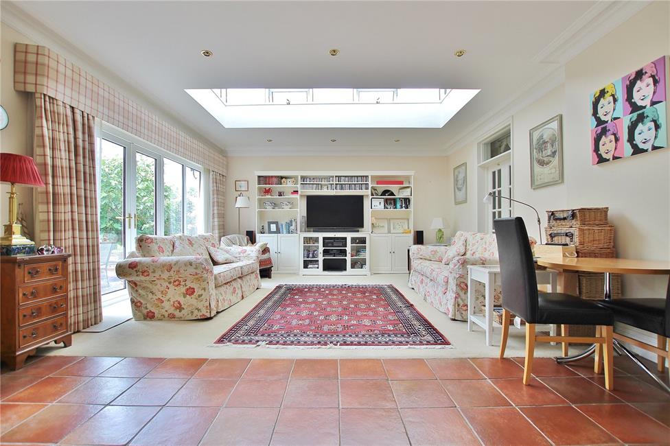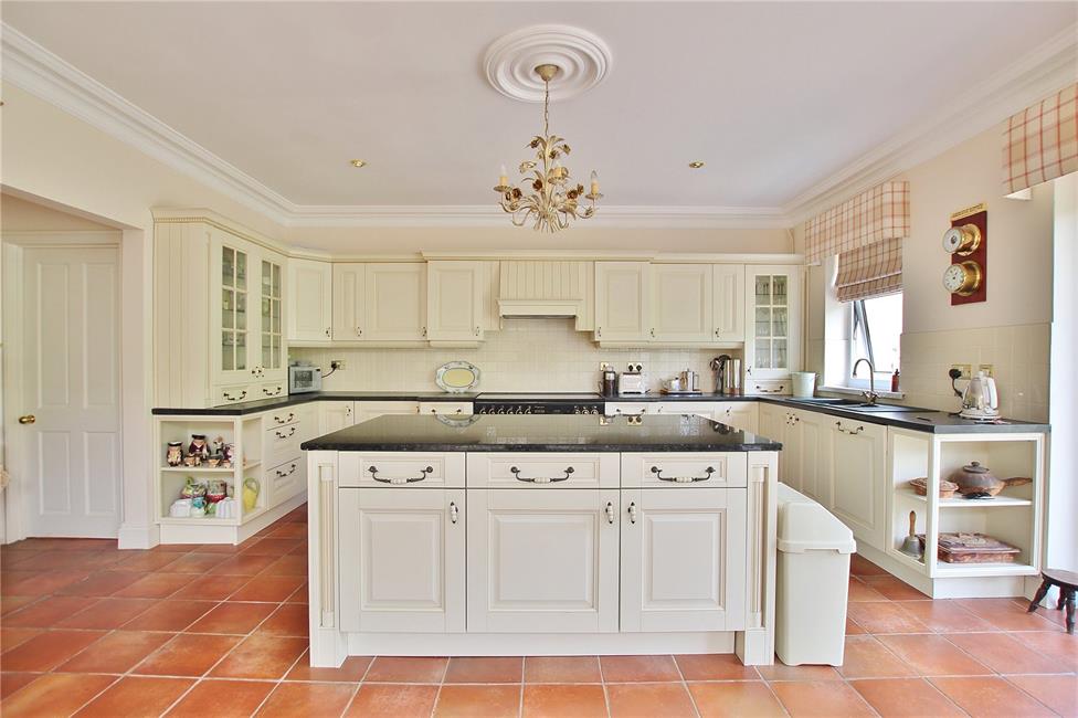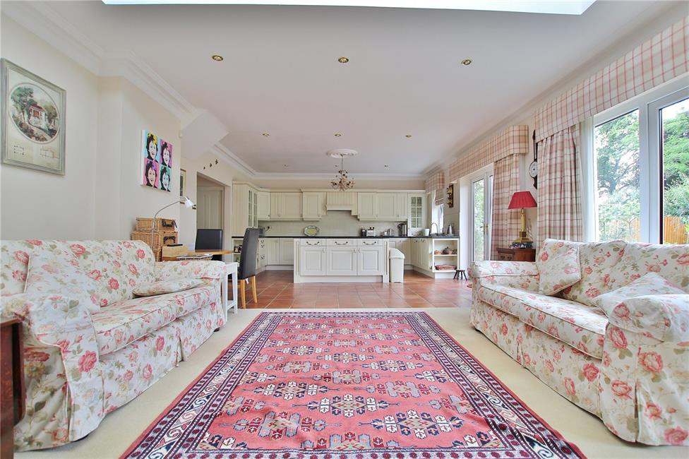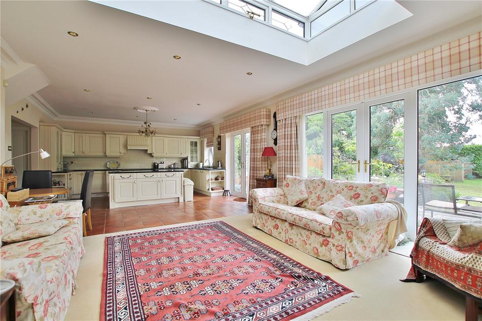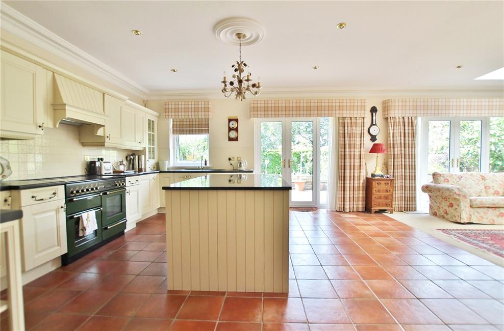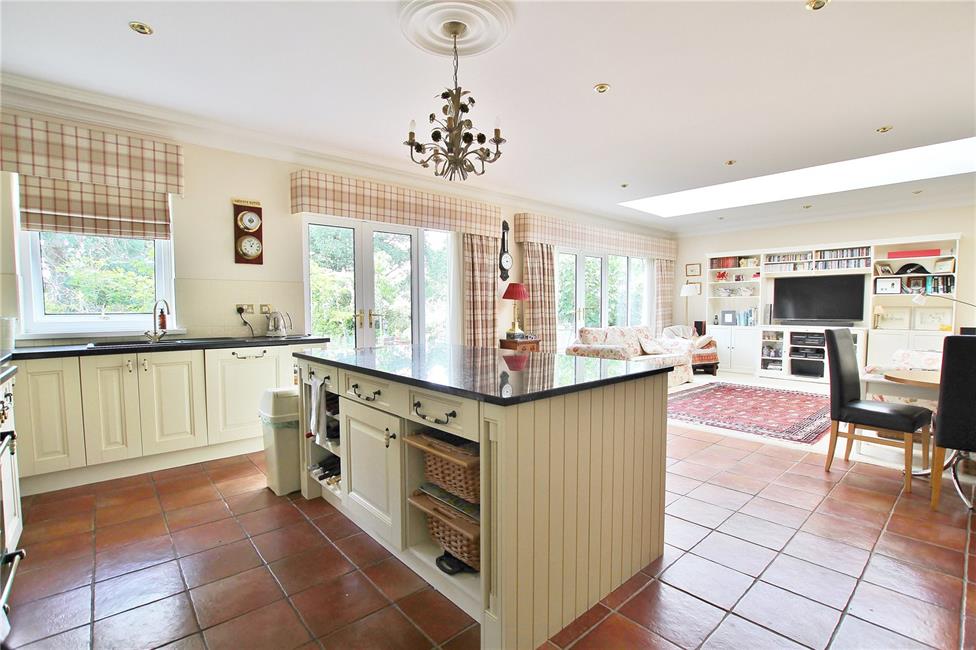 Of excellent proportions, fitted along three sides beneath round nose worktop surfaces, inset 1.5 bowl sink and drainer with mixer tap, matching range of base and eye level wall cupboards with pelmets and borders, courtesy lighting, Rangemaster five-ring cooker with hotplate and ovens below, circulating fan above, attractive glazed display cabinet, feature central island with granite top, three radiators, wealth of base and storage cupboards, ceramic wall tiling to worktop areas, integrated dishwasher with matching front, storage wine racks and wicker basket with vegetable retractable racks, terracotta style tiled flooring, double glazed French doors and matching side screen overlooking the delightful rear garden, opening to family room with central light monitor, coved ceiling, ceiling spotlighting, central twin French doors and matching side screen leading onto the rear patio and garden, bespoke wall mounted display/ TV consul with book shelving, base and storage cupboards.