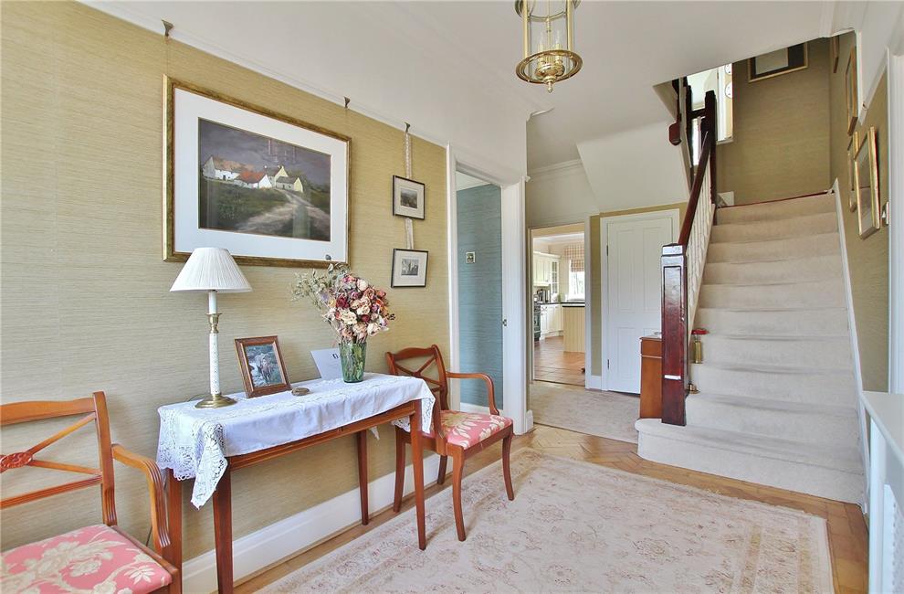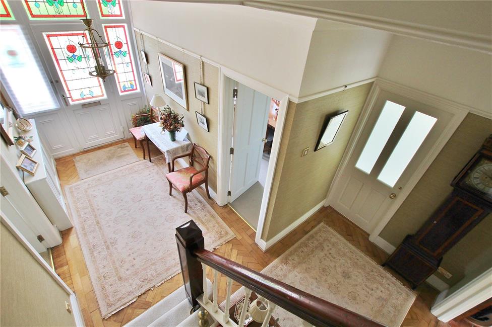 Approached via an attractive uPVC panelled front door with double glazed decorative inserts to upper part, matching side panels and fanlights above, leading onto a wide central hallway with single flight staircase to first floor level with newel posts and spindle banister, tall cornice ceiling, woodblock flooring, radiator with radiator cover, deep store cupboard under stairs recess with lighting.