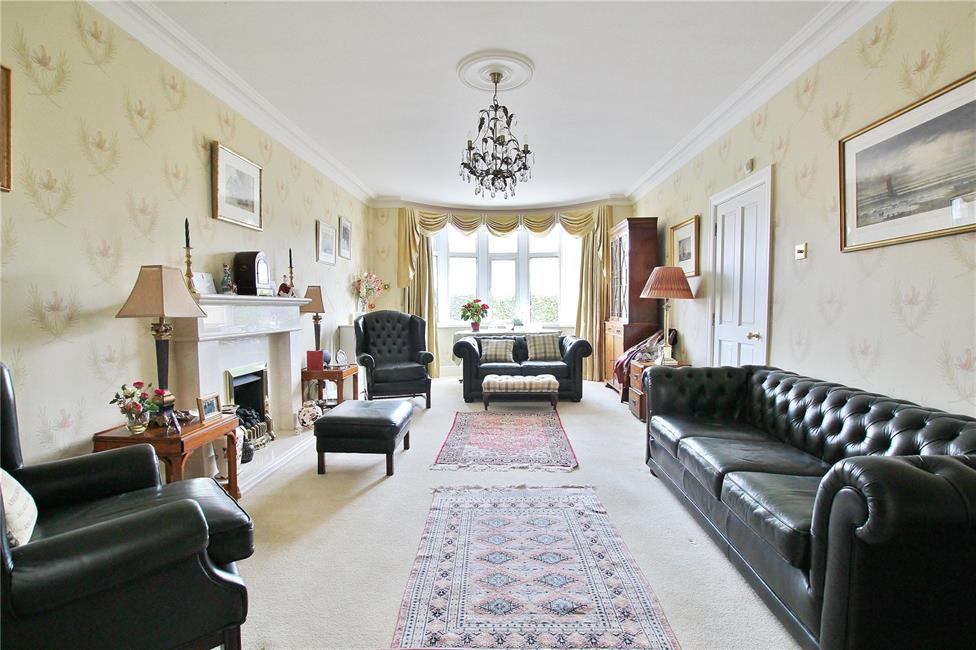 Overlooking the entrance approach, attractive fire surround with matching hearth and mantle, two radiators with radiator covers, coved cornice ceiling, small paned bevelled glass twin doors leading to kitchen/family room.