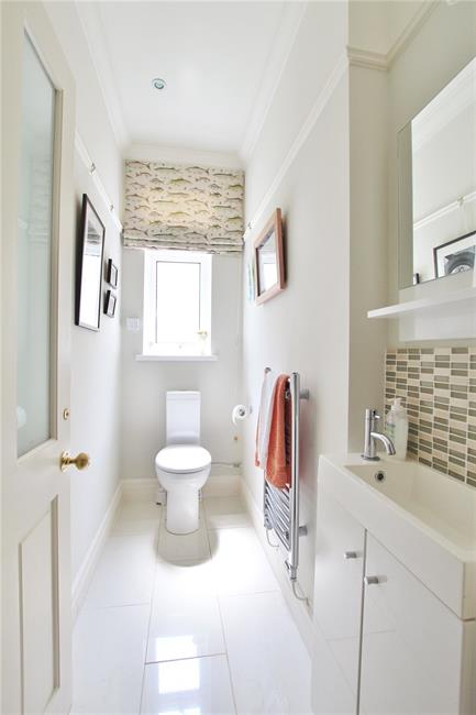 Stylish modern suite comprising low level WC, wash hand basin, cabinets below, attractive wall tiling, high gloss floor tiling, heated chrome towel rail.