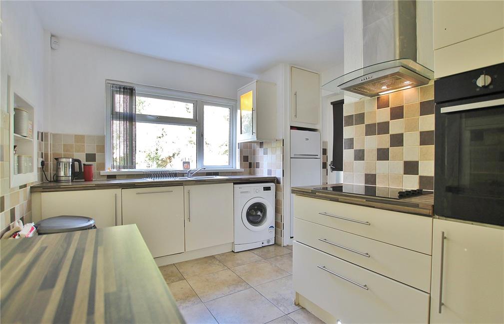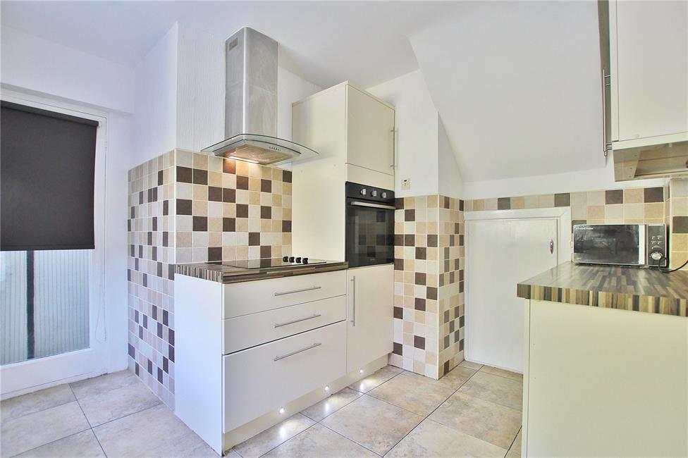 Appointed along three sides in light cream finish fronts beneath lipped worktop surfaces, inset stainless steel 1 ½ full sink and drainer with mixer tap, 4 ring electric hob with cooker hood above, fitted oven, space for fridge freezer, space and plumbing for automatic washing machine, built-in dishwasher, matching range of eye level units, ceramic wall tiling to worktop surrounds, useful under stairs storage cupboard, tiled flooring. Door to rear lobby.
