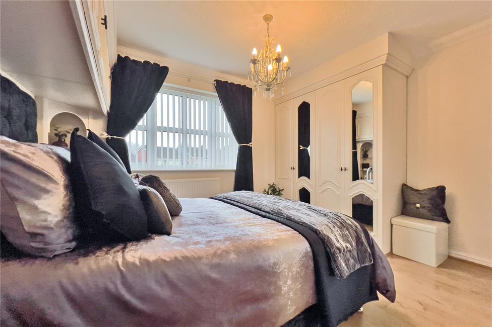 Overlooking the private front garden and quiet end of cul-de-sac, radiator, laminate flooring, an abundance of built-in furniture comprising of double wardrobes, single wardrobe, bedside cabinets, open shelving and bridging unit, door to . . .