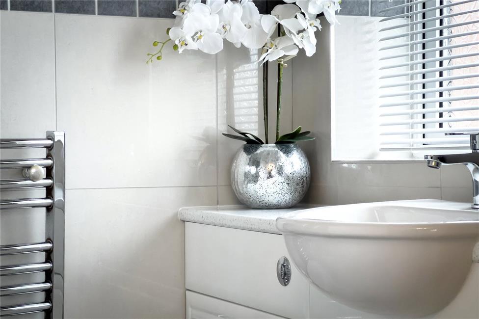 A modern white suite comprising of a close coupled push button WC, wall mounted ceramic wash hand basin with storage beneath, ceramic wall tiling to half height, heated chrome towel rail, ceramic floor tiling.