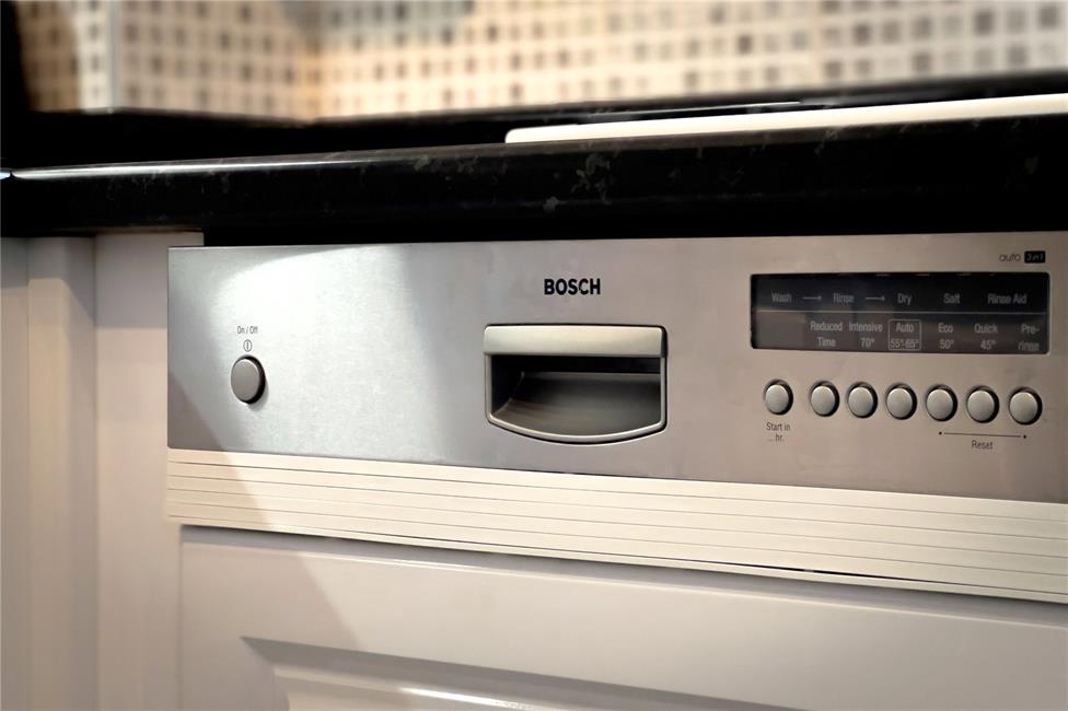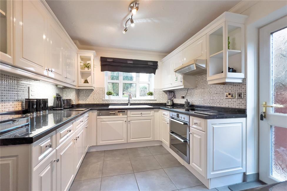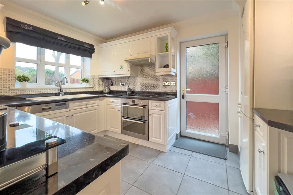 Overlooking the rear garden, a modern white gloss finish kitchen appointed along four sides comprising of eye level units and base units with drawers and round nosed worktops over, ceramic wall tiling to work surface surrounds, inset 1.5 bowl sink with mixer tap, fitted Bosch electric hob with electric double oven below and cooker hood above, integrated Bosch dishwasher, space for upright fridge/freezer, existing plumbing for washing machine, double radiator, ceramic floor tiling, additional uPVC double glazed door to the side giving access to the front and rear.