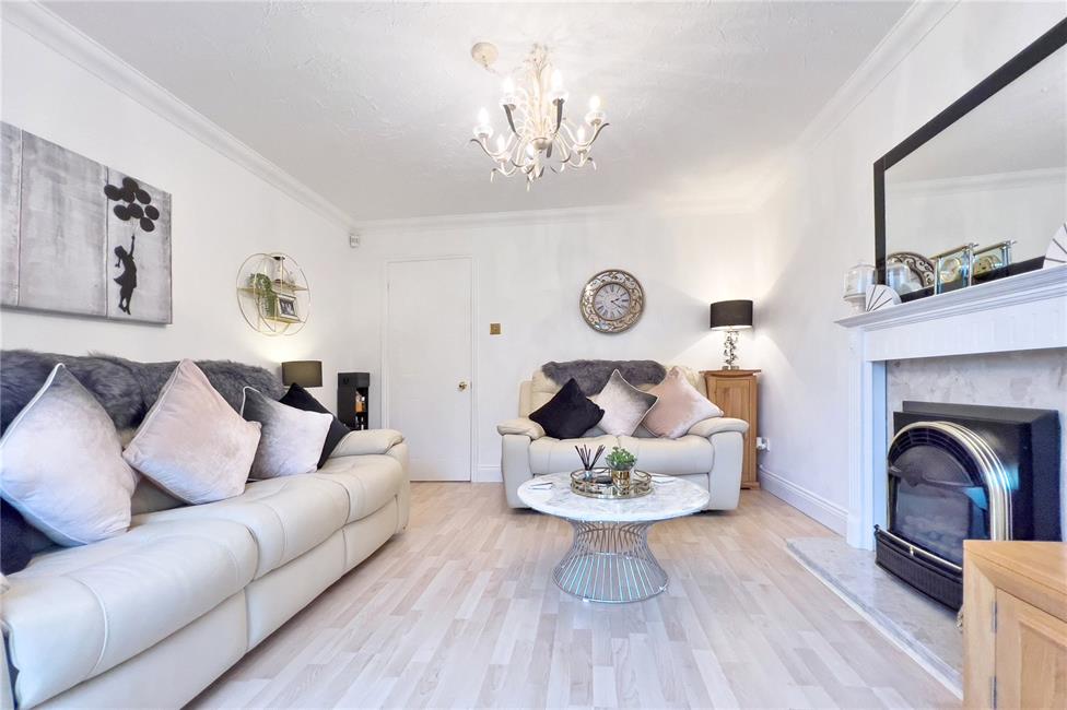 uPVC double glazed bay window overlooking the large enclosed front garden and quiet end of cul-de-sac, radiator, laminate flooring, high level skirting boards.