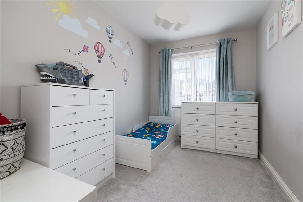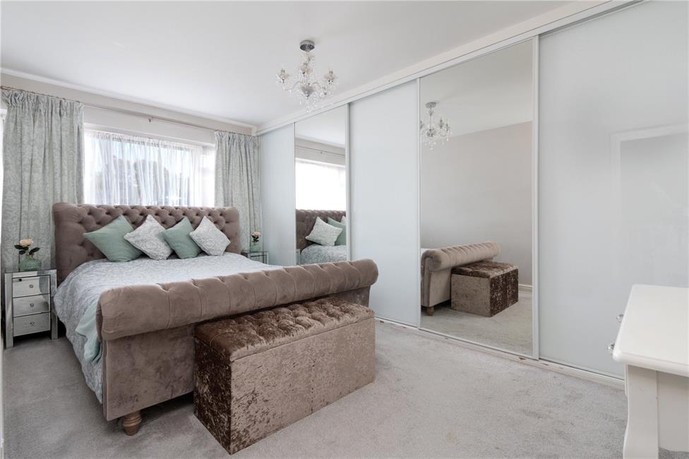 Overlooking the entrance approach, range of fitted wardrobes along one complete side with mirrored centre section, double panelled radiator.