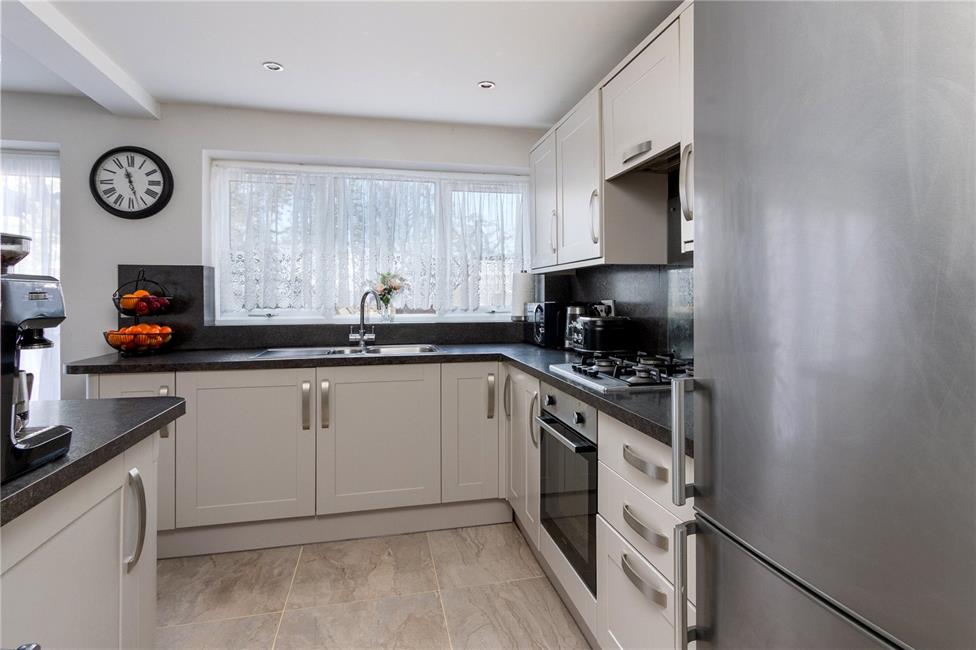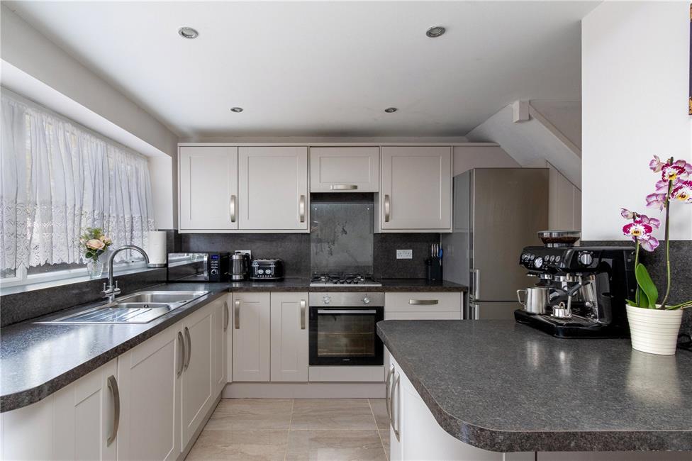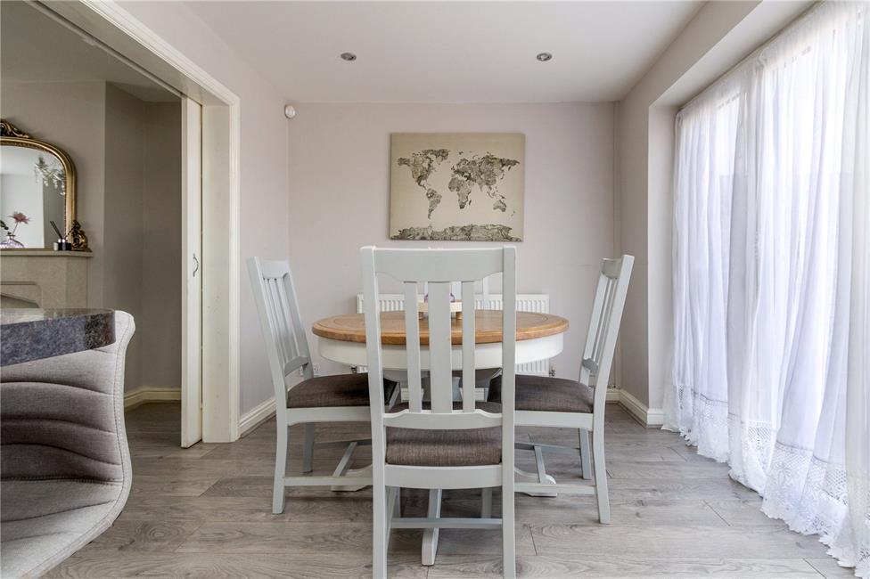 Of excellent proportions, fitted along three sides in light grey fronts beneath lipped worktop surfaces, inset 1.5 bowl stainless steel sink and drainer with mixer tap, matching range of base and eye level wall cupboards, inset four ring gas hob with circulating fan above, oven below, plumbed for automatic washing machine with matching front, feature breakfasting bar with base cupboards, quality high gloss floor tiling, radiator, ceiling spotlighting, pleasing aspect to the sunny rear garden, opening to dining area with ample space for dining table, panelled radiator, bi-folding doors leading to the rear patio and garden, quality flooring.