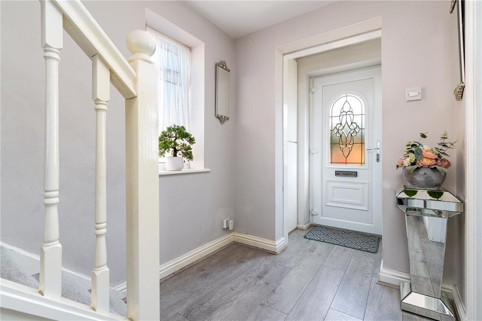 Attractive Georgian style external facade, double glazed uPVC door with decorative glazed leaded light window to upper part, leading onto the entrance vestibule area, storage cupboard to side housing Worcester gas central heating boiler, leading onto a bright central hallway with single flight staircase to first floor level, storage cupboard under stairs recess, quality flooring, double glazed window to side, panelled radiator.