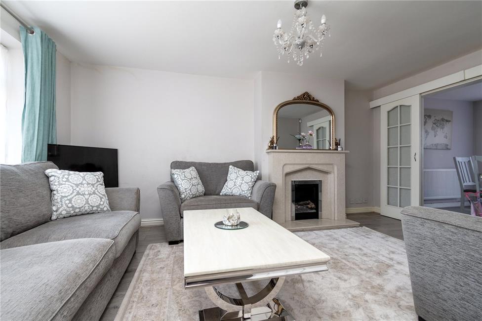 Overlooking the attractive front garden, a good size principal reception with feature contemporary style marble finish fireplace with matching hearth and mantel, coal effect electric fire, quality flooring, panelled radiator, small paned sliding twin doors leading to kitchen/family room.