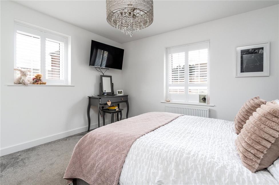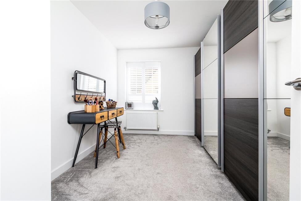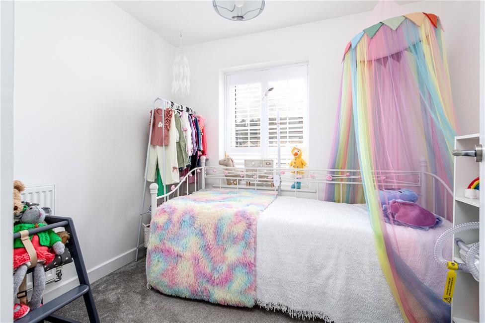 A generous third bedroom overlooking the cul-de-sac, radiator, ample space for wardrobes.