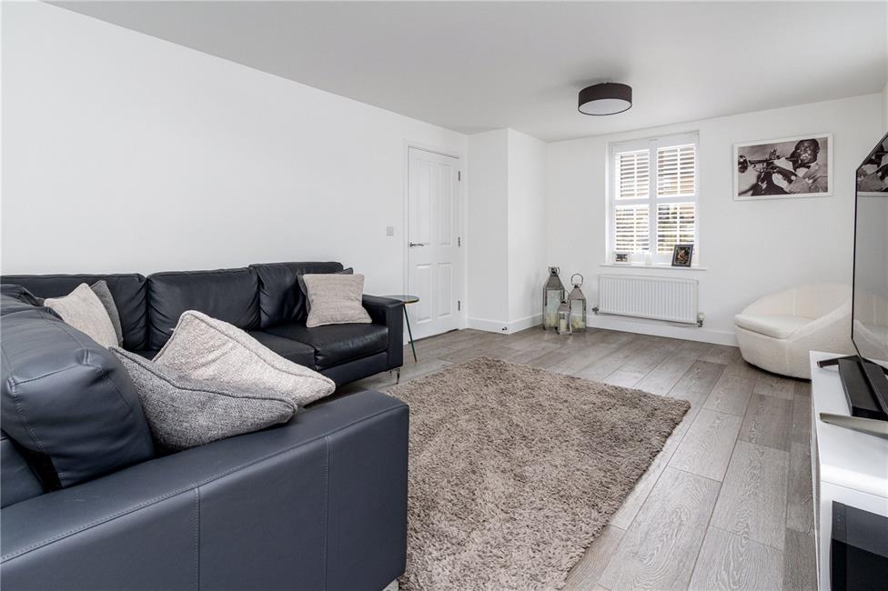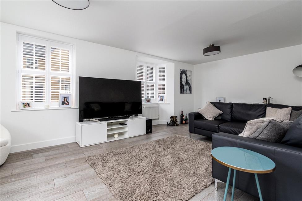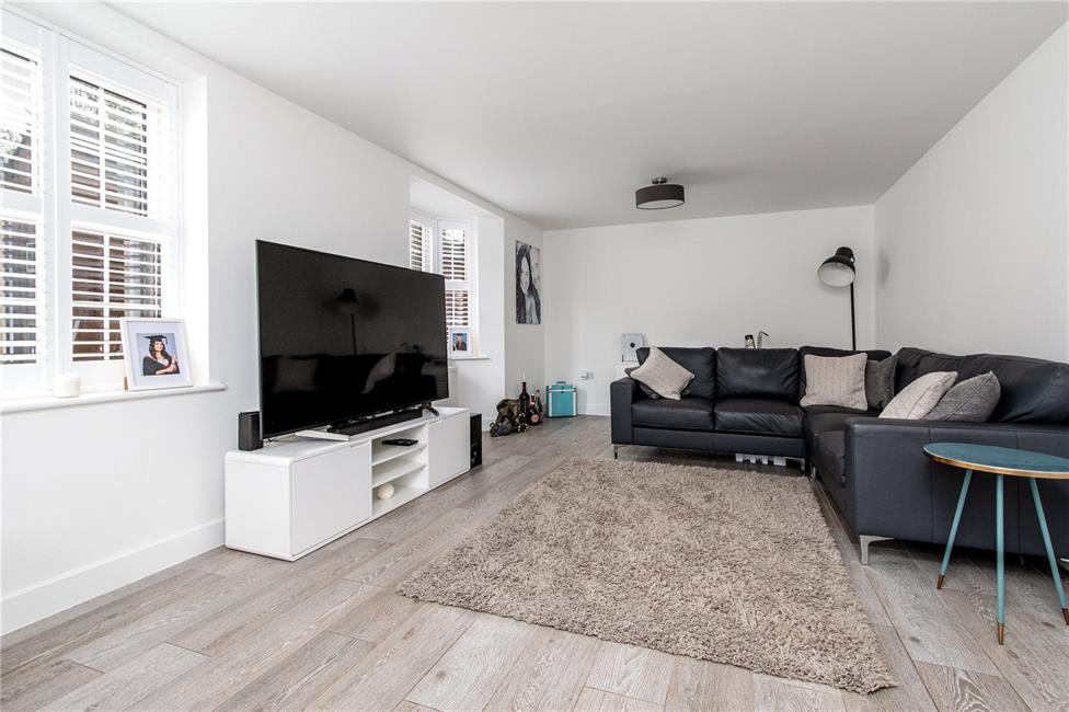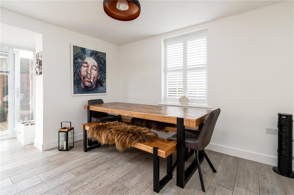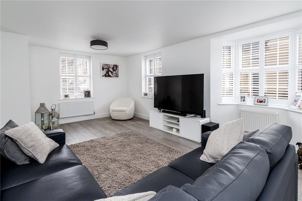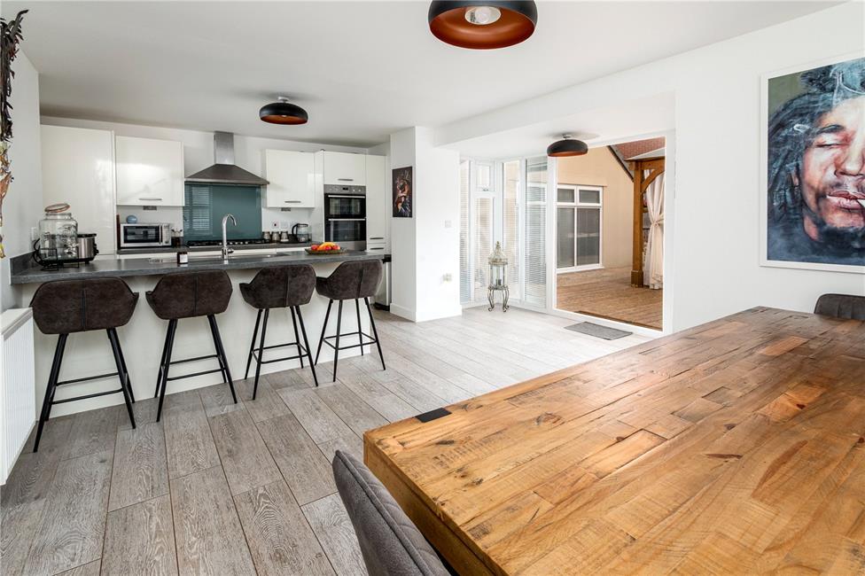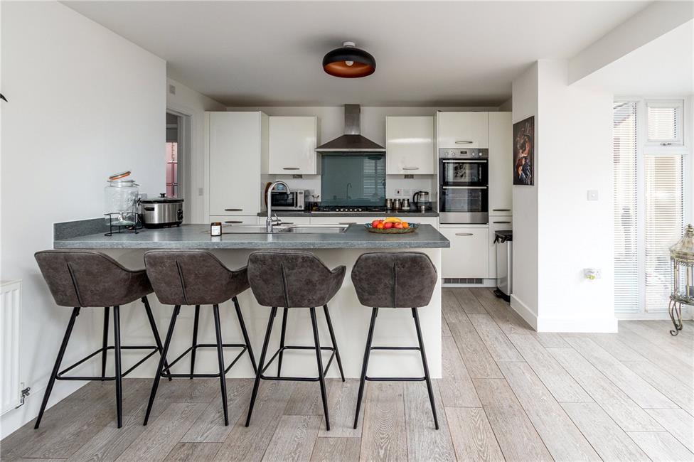 Beautifully appointed white gloss finish kitchen with brush chrome handles comprising of soft close eye level units and base units with deep pan drawers and stone effect worktops over with matching upstand, inset sink on the peninsular breakfast bar, quality six-burner gas hob with wide extractor hood above and glass coloured splashback, built-in electric double oven and grill, integrated dishwasher as well as fridge and freezer, continuation of the quality light grey oak effect flooring, ample space for dining table and chairs, TV point, two radiators, windows to the front and a large feature bay section with full-height windows and French doors giving access to the rear garden.