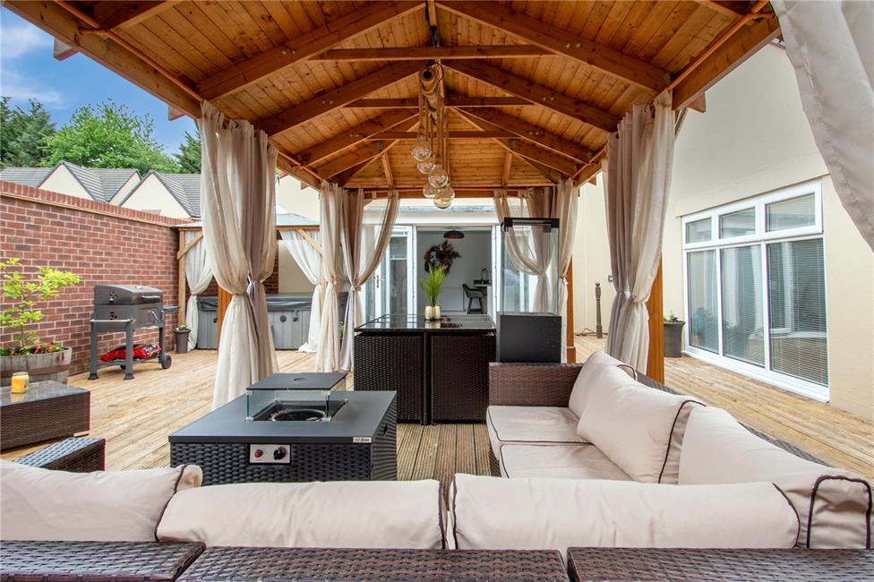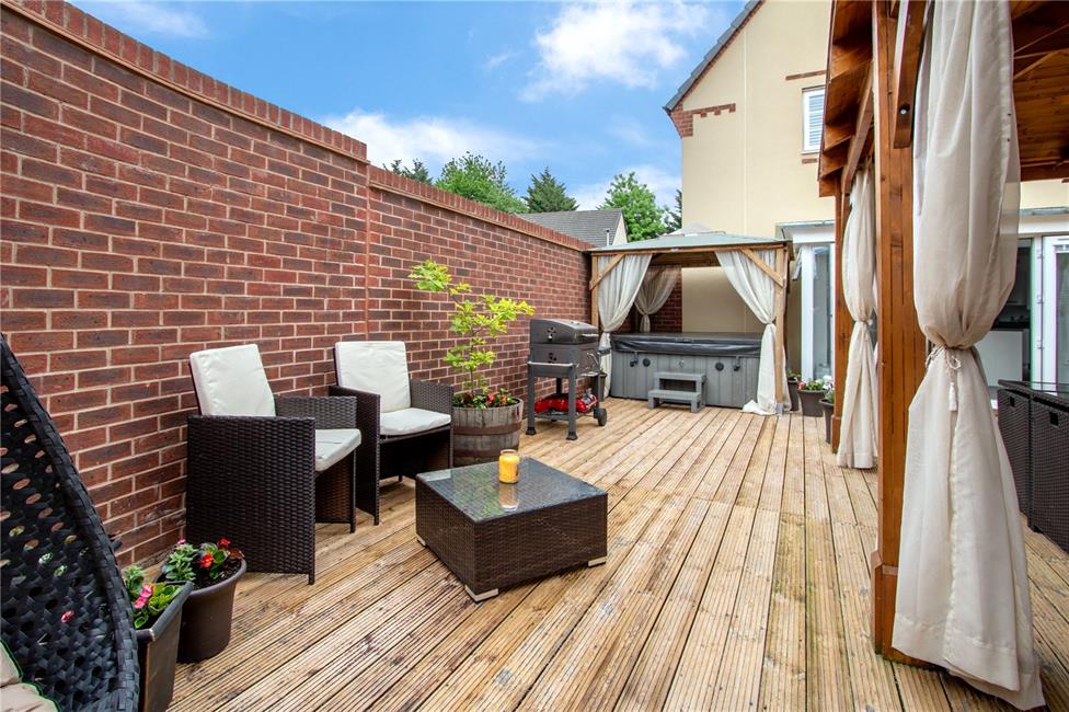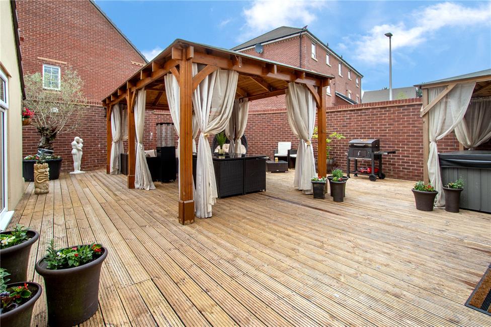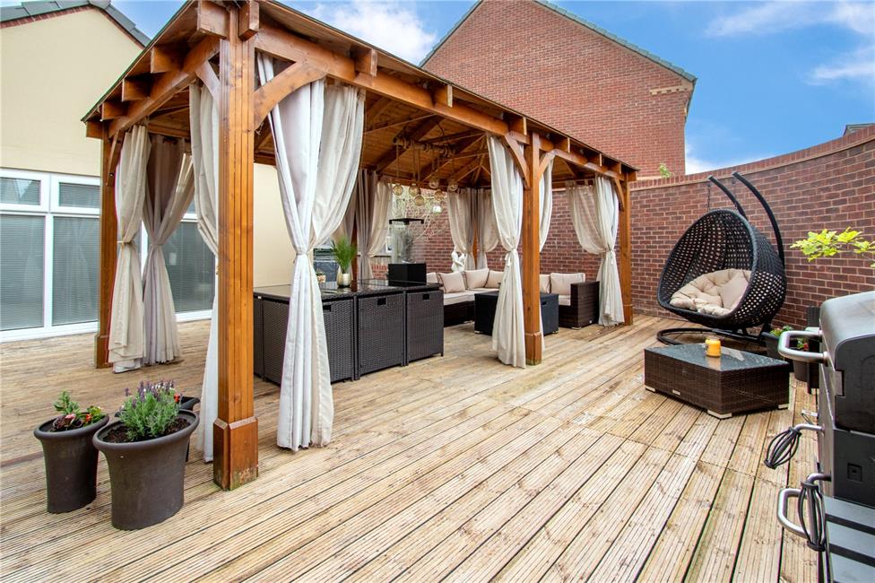A beautifully refurbished and newly designed garden with brick curved boundary wall, garden laid with quality decking with feature central covered seating area, space behind the garage, side access gate from the driveway.