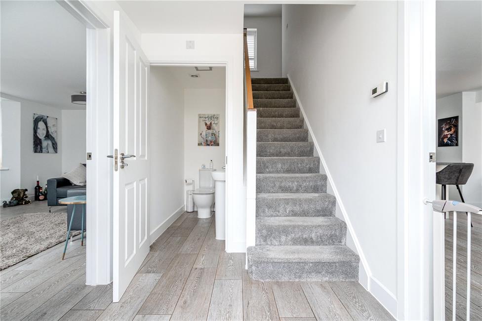 Approached via a double glazed composite entrance door with leaded glass, a quality light grey wood effect flooring, radiator, easy rising spindle staircase leading to the first floor landing, full height storage cupboard with continuation of flooring and telephone point.