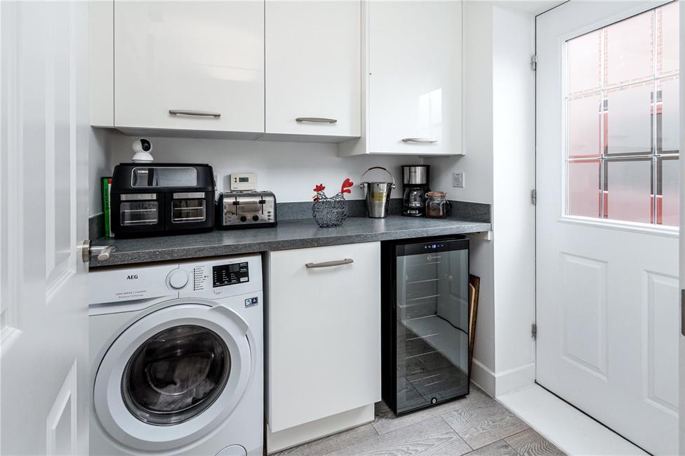 Matching eye level units and base unit with stone effect worktop over with matching upstand, plumbing and space for washing machine, additional space for a separate tumble dryer, continuation of the quality flooring, radiator, wall mounted gas central heating boiler concealed behind a matching wall unit (last serviced July 2020), double glazed composite door to the rear giving access to the driveway.