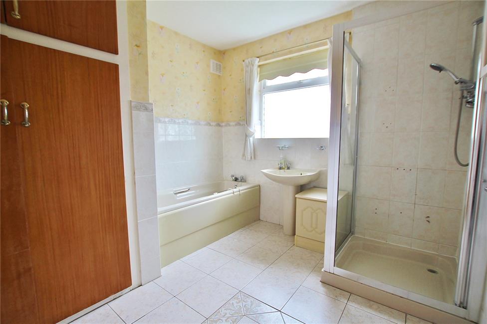 Opaque window to rear, cream suite comprising of a twin grip panelled bath with wall tiling to half height, pedestal wash hand basin, large shower cubicle with bi-fold door and thermostatic controls, ceramic floor tiling, radiator, built-in double airing cupboard with shelving and overhead storage.