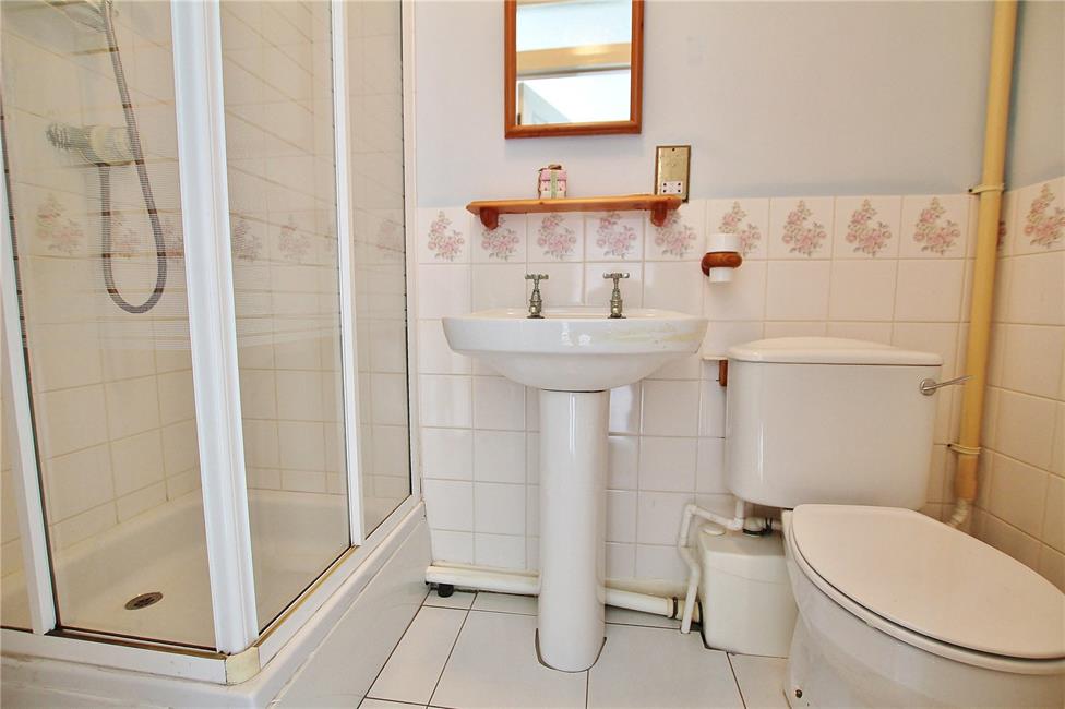 Shower cubicle with thermostatic shower and ceramic wall tiling, pedestal wash hand basin, close coupled WC, tiled flooring, shaver point.