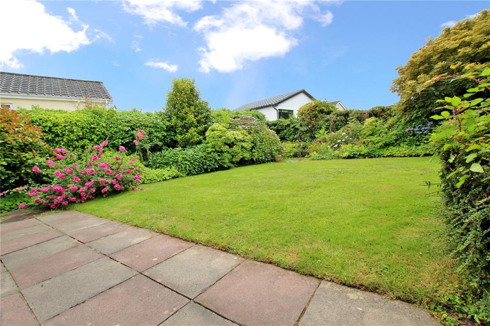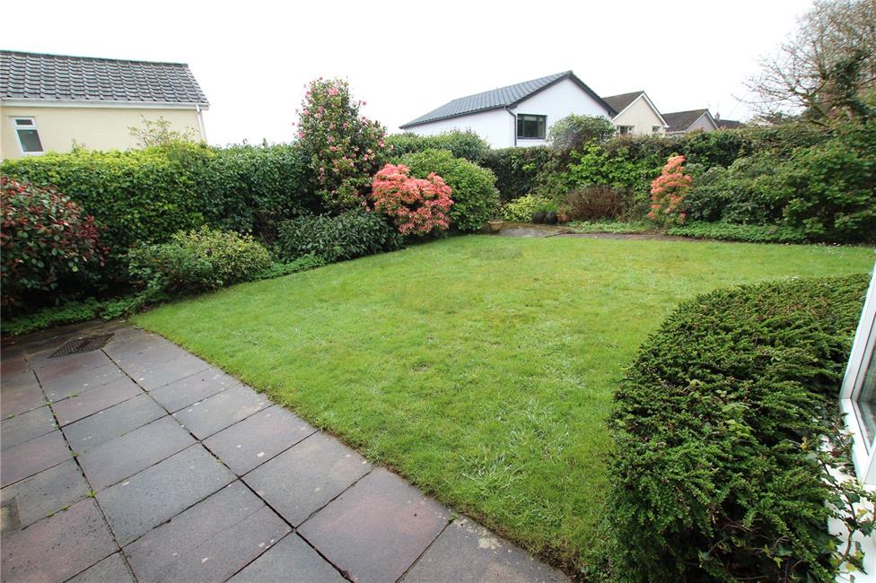 A raised front garden laid to lawn with bordering flowers and shrubbery, retaining wall to the front pavement, a double width keyblock driveway leads to the double garage, steps and path with balustrade lead to the front door, side access to the rear garden.