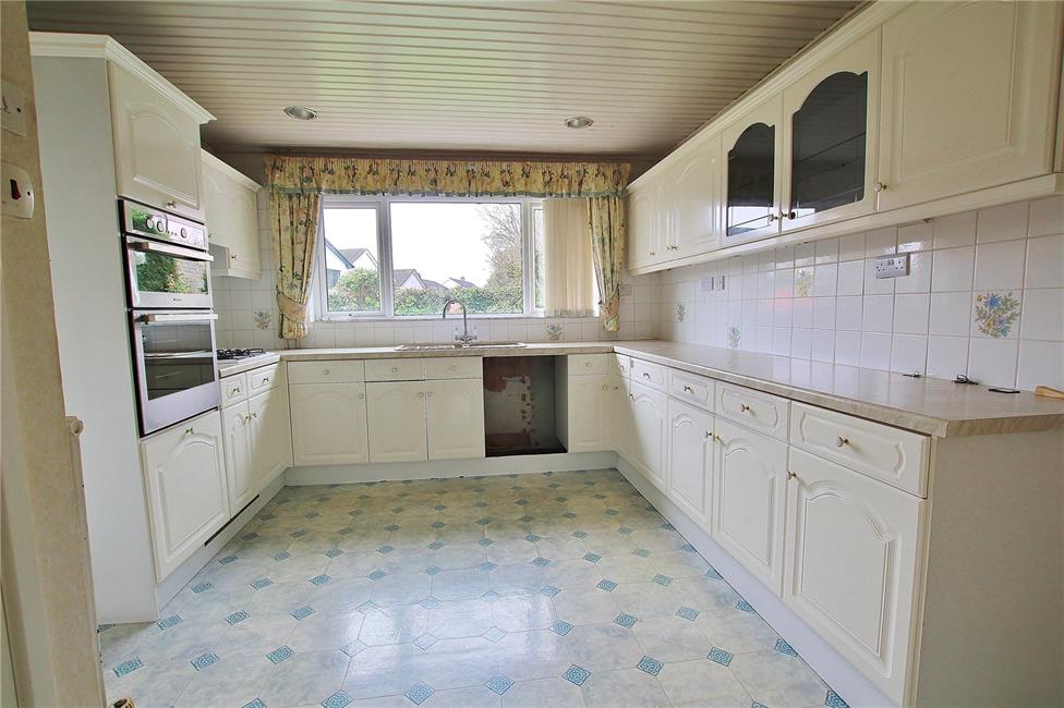 Overlooking south south-west rear garden, a white kitchen appointed along three sides comprising of eye level units and base units with drawers and round nosed worktops over, inset sink with mixer tap, fitted four burner gas hob with cooker hood above, built-in double oven and grill, plumbing and space for washing machine or dishwasher, double radiator, tile effect cushion flooring, larder cupboard with shelving and light, internal door to rear porch.