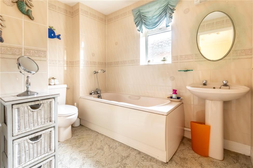 Modern suite comprising pedestal wash hand basin, low level WC, panelled bath with hand grips, shower mixer, ceramic wall tiling with border tile, chrome heated towel rail, double glazed window to side.