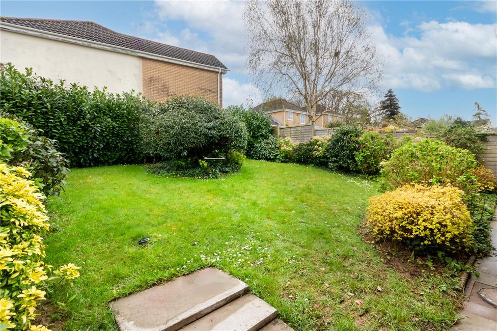 Laid to lawn having a paved patio sitting out area, enjoying a private aspect enclosed by timber lap fencing and shaped hedge and flower borders. Paved pathway to side with gate leading to front.