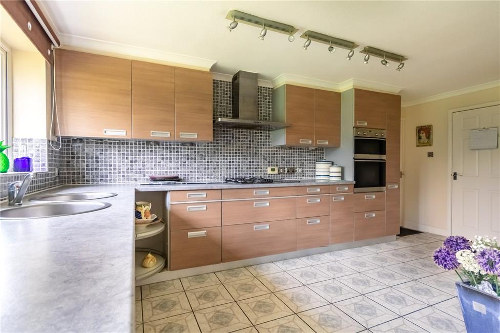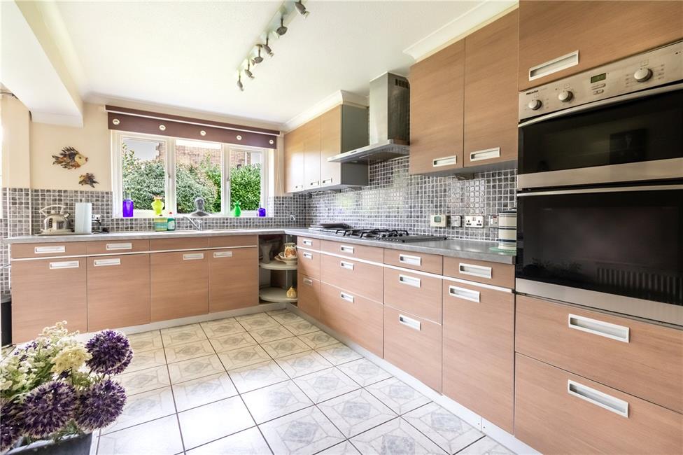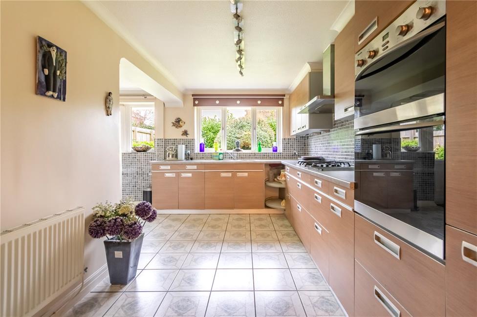 L-shaped, well appointed along two sides beneath round nosed worktop surfaces, inset four ring AEG gas hob with circulating fan above, matching range of base and eye level wall cupboards, pelmet lighting, Miele integrated oven with separate grill, inset twin stainless steel bowls with mixer tap, concealed gas central heating boiler, ceramic wall tiling to worktop areas, pleasing aspect to the rear garden, panelled radiator, tiled flooring, opening to breakfasting area with matching tiled bistro table with display wine rack below, tiled flooring, panelled radiator, double glazed door and window overlooking the rear garden.