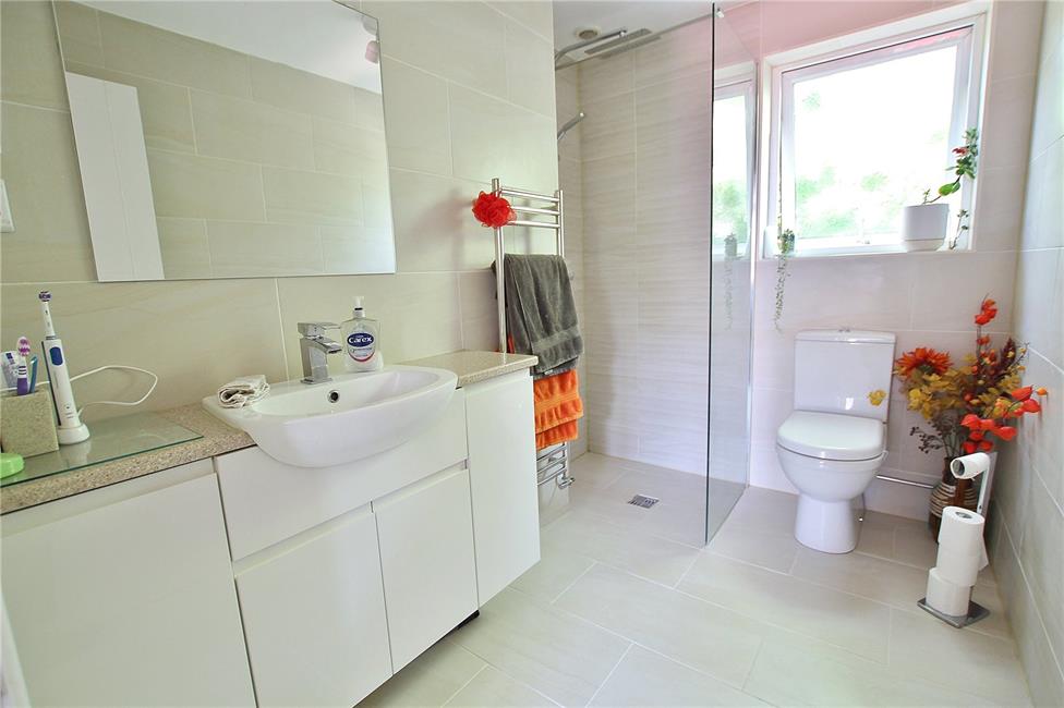 Opaque window to the rear, a walk-in wet area with fixed glazed shower screen and rainfall style showerhead with flexible hose, thermostatic controls, comprehensive wall and floor tiles, sunken drain, close coupled push button WC, half sunken wash hand basin with storage below, and worktop above, fixed vanity mirror with shaver point and lighting. Under floor heating, heated chrome towel rail.