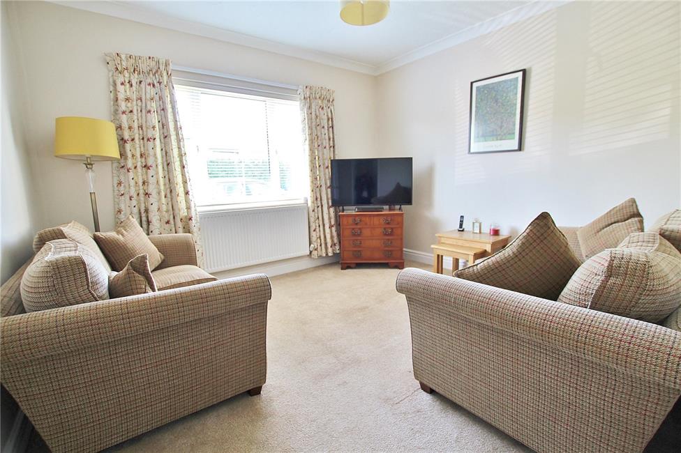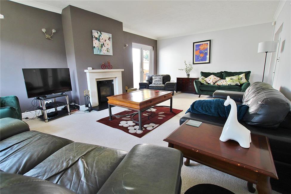 Windows to the front and side, French doors giving access to the rear garden, a feature mock stone fire place surround with log burner set on black granite hearth, two radiators, TV point.