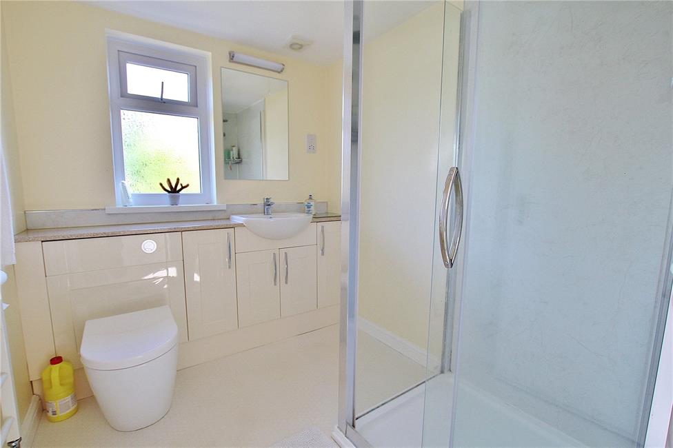 Opaque window to the rear, large purpose built shower cubicle with fixed rainfall style shower head over and flexible handle with thermostatic controls, close coupled push button WC with concealed cistern, half sunken wash hand basin with storage below and work surface above, vanity mirror with lighting, shaver point, heated towel rail, cushion flooring.