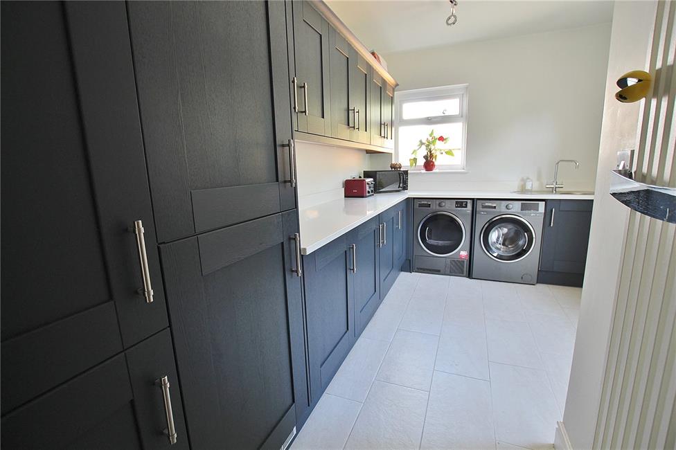 Aspect to the side and rear, continuation of kitchen units with eye level units and base units, with work tops over with matching upstand, full height larder cupboard two integrated freezer, second integrated fridge, corner carousel unit, continuation of the ceramic floor tiling, a second stylish sink and drainer, plumbing and space for a washing machine and separate drier, door giving access to rear garden and vertical radiator.