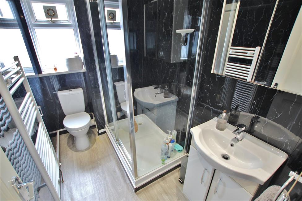 Stylish suite comprising porcelain wash basin with cabinets below, double width shower cubicle with thermostatic shower and rainfall style shower head, low level WC, uPVC wall panelling, heated towel rail, quality flooring.