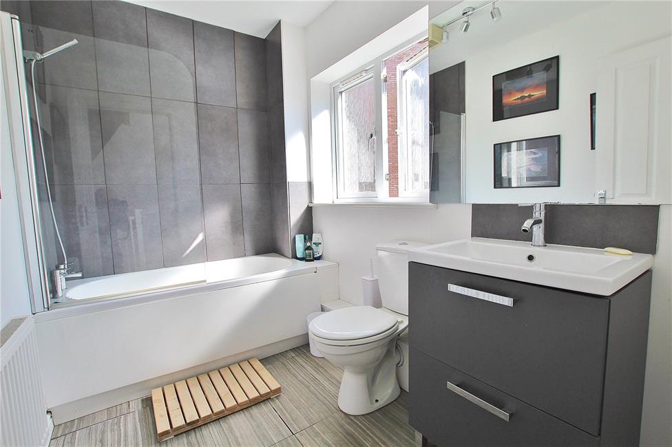 A modern white suite comprising of a panelled bath with shower mixer taps over, glazed shower screen and ceramic wall tiling, opaque window to the rear, close coupled push button WC, sunken wash hand basin with storage beneath, large vanity mirror above, shaver point, radiator, laminate floor tiling.