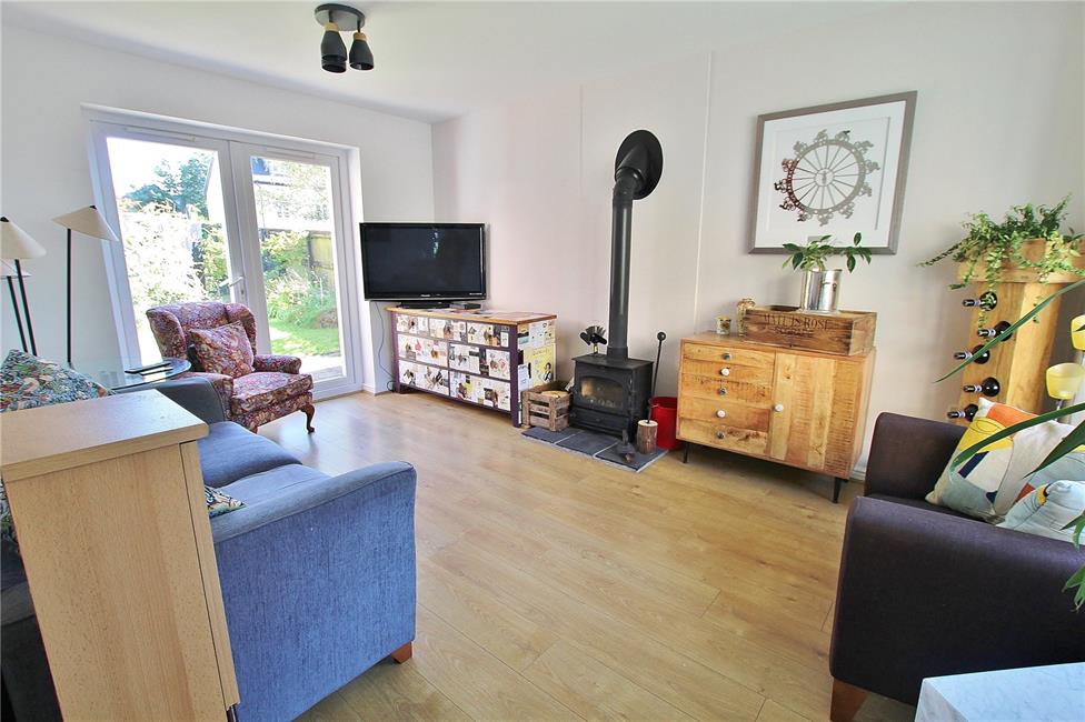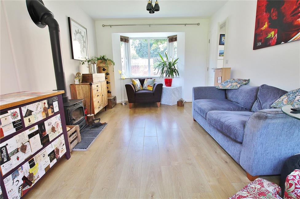 Dual aspect with a double glazed bay window to the front and French doors opening onto the rear garden, two radiators, TV and telephone points, feature log burner on a slate hearth, laminate flooring.