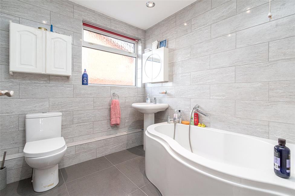 Opaque window to the side, a refurbished white suite comprising of a corner bath, pedestal wash hand basin, close coupled w/c, ceramic floor and wall tiling, radiator.