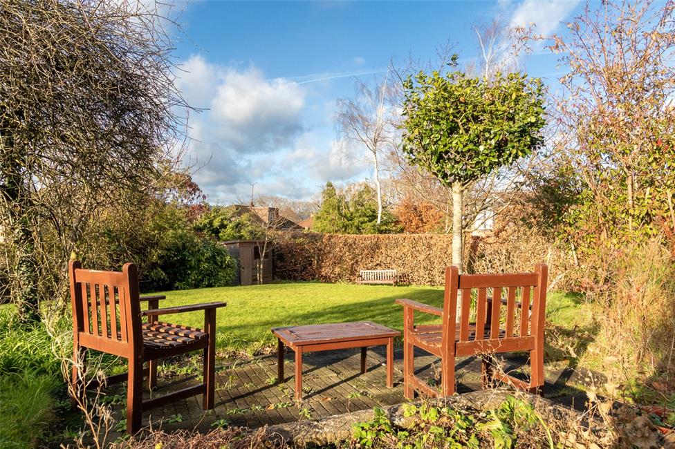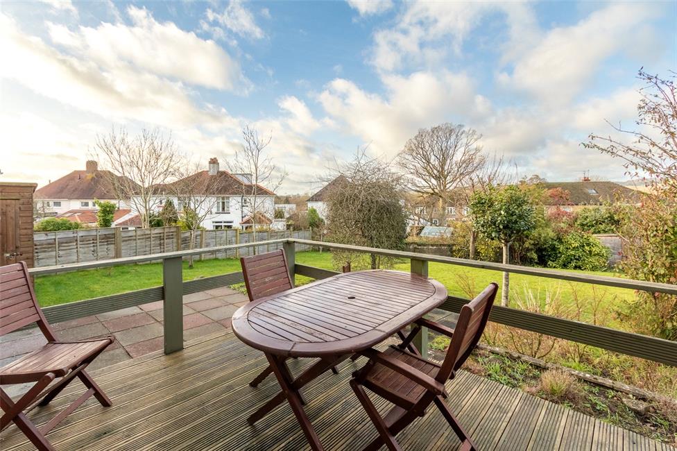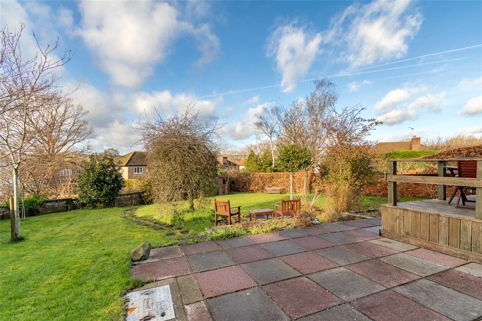 Initial raised decked area leading down to a large patio relaxation area which continues on to a further patio and a large widening garden laid to lawn, timber garden shed to the side with gated access from both wide sides, outside lighting, outside water tap, a large circular path running around the perimeter of the lawn, with