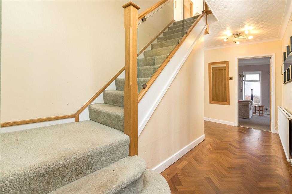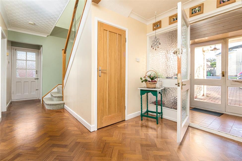 Large central hallway giving access to all of the ground floor accommodation, original herringbone style woodblock flooring, double radiator, large under stairs storage cupboard with further woodblock flooring, easy rising staircase with 'Neville Johnson' glazed banister leading to first floor landing. Door to a side porch.